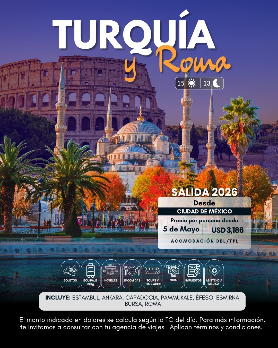 ¡Lo mejor de dos mundos! Del 5 al 19 de mayo, cruza fronteras en un viaje épico desde México hasta Estambul y Roma. Sorpréndete con los globos en Capadocia, las aguas termales de Pamukkale y el arte eterno de Florencia y la Fontana de Trevi. Con vuelos por Turkish Airlines y guías en español, ¡esta es la aventura que tu pasaporte necesita! Reserva hoy y asegura tu lugar en esta ruta inolvidable.